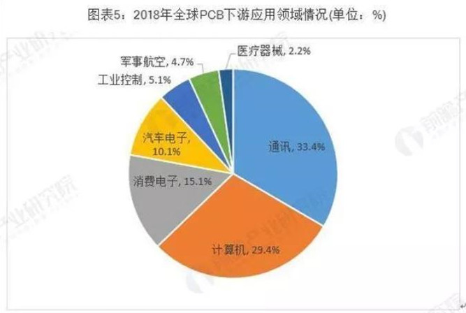 電子信息產(chǎn)業(yè)的蓬勃發(fā)展是PCB行業(yè)發(fā)展的重要助力。從下游應(yīng)用領(lǐng)域分布來看,2018年通訊行業(yè)的PCB市場(chǎng)規(guī)模最大,占比約為33.4%;其次是計(jì)算機(jī)行業(yè),占比約為29.4%。其他領(lǐng)域PCB市場(chǎng)規(guī)模較大的是消費(fèi)電子、汽車電子。